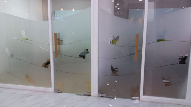 Partisi minimalis dari kaca akan terlihat lebih cantik jika ditambahkan stiker dengan beragam bentuk.